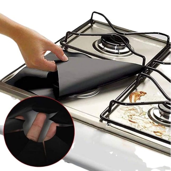 Set 4 Folii Teflon Reutilizabilă 27x27 cm pentru Aragaz sau Plită, Rezistentă Termic -60°C până la 260°C, Negru, Grosime 0.3 mm