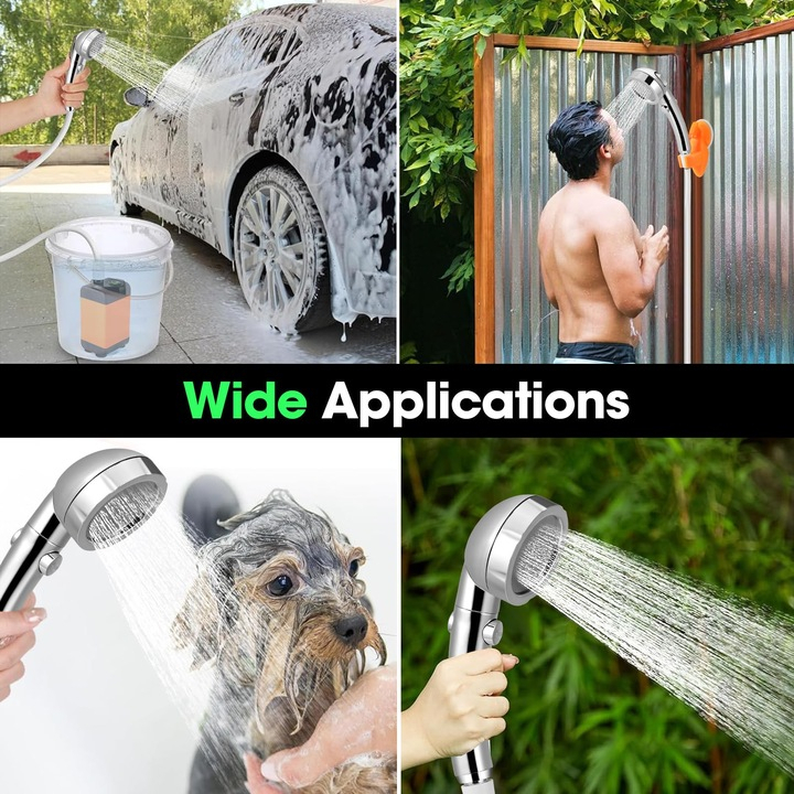 Duș portabil camping 7800 mAh, autonomie 180–200 min, display temperatură, încărcare USB