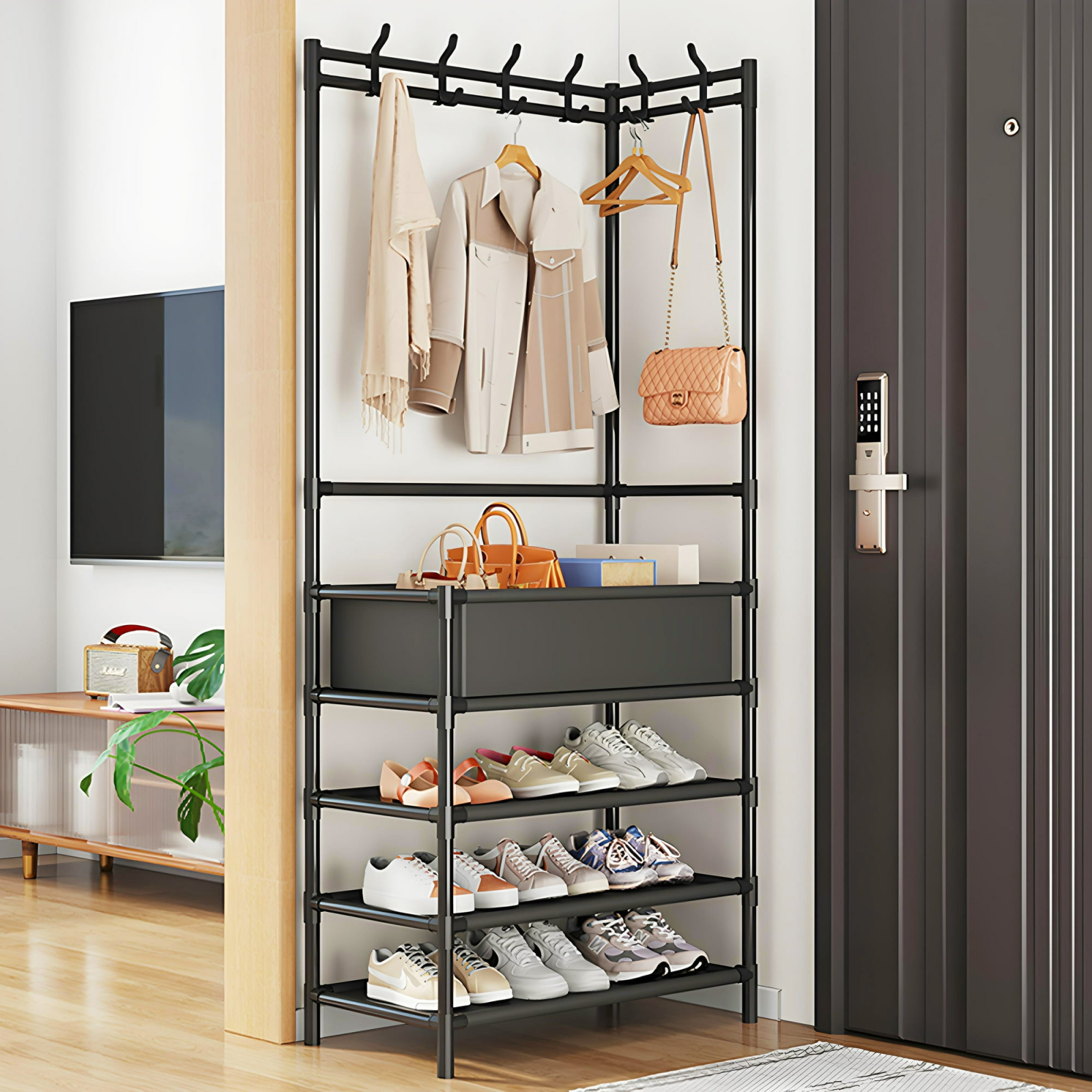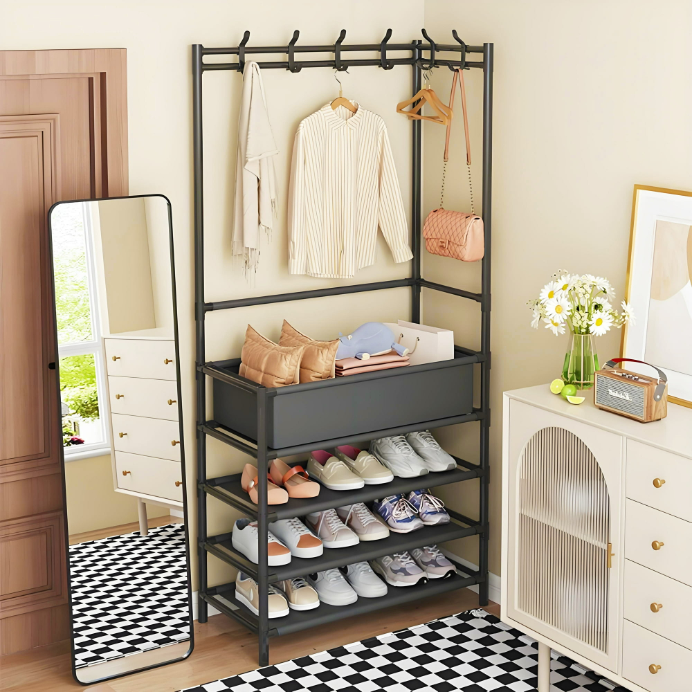 Menține ordinea și stilul în hol, dormitor sau birou cu acest cuier metalic robust, proiectat pentru depozitare eficientă a hainelor și încălțămintei. Designul modern și structura solidă îl fac un element practic și estetic în orice spațiu.