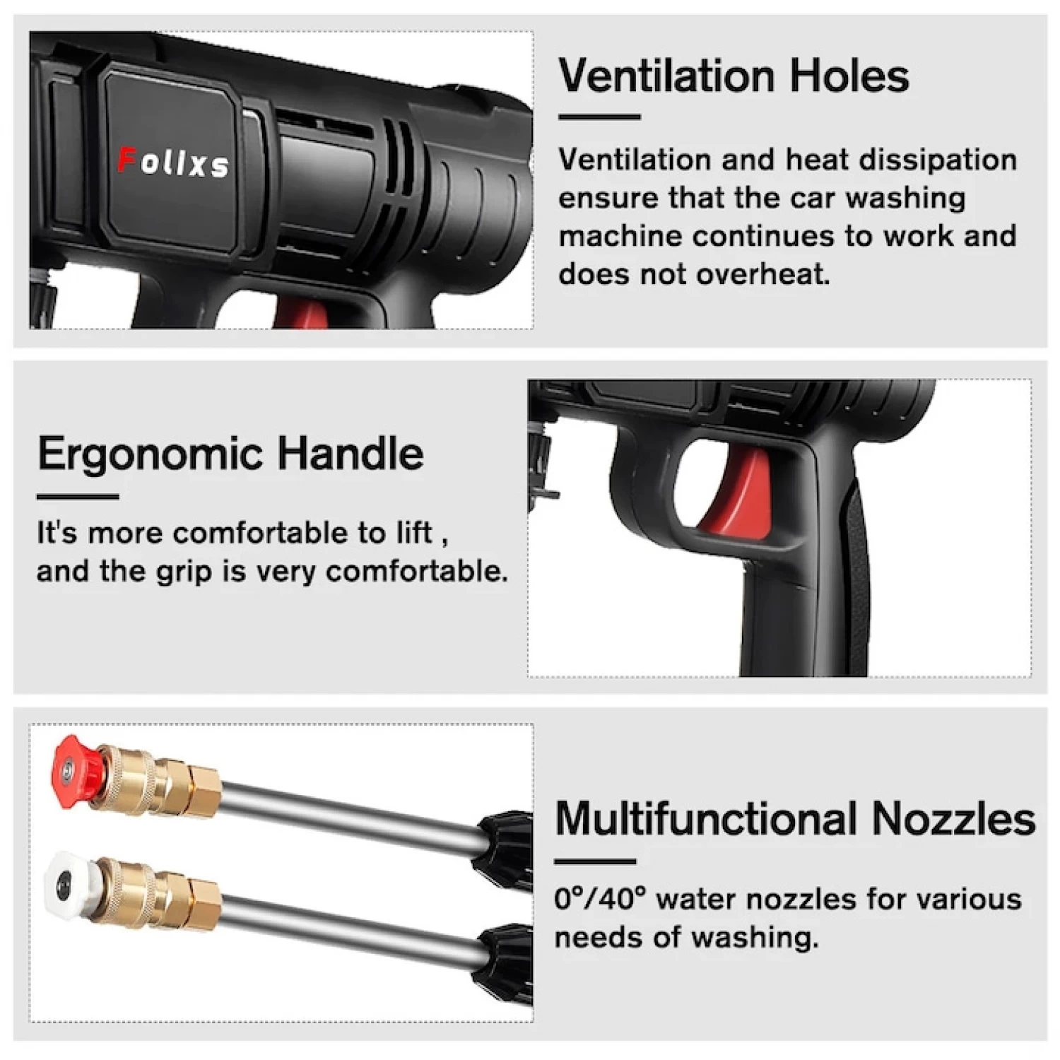 4 duze de pulverizare + rezervor de spuma – Selecteaza unghiul de jet potrivit: 0°, 15°, 25°, 40°, sau utilizeaza spuma pentru spalare auto.