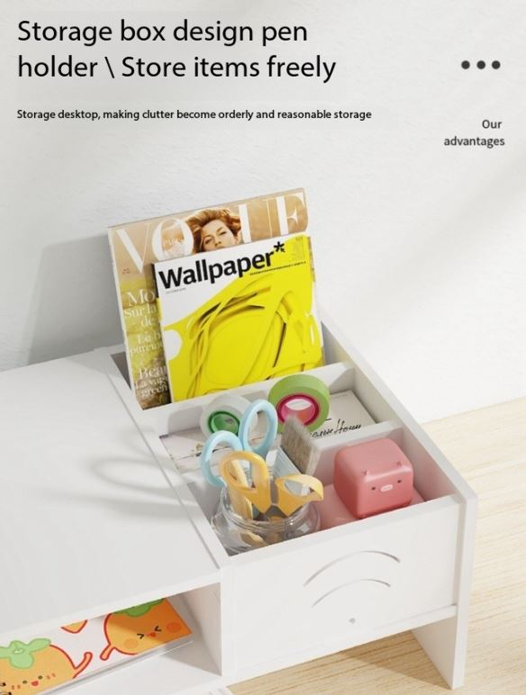 Structura practică include spațiu de depozitare integrat, ideal pentru organizarea accesoriilor de birou, documentelor sau a altor obiecte utilizate frecvent. Designul modern în culoare albă se integrează ușor în orice birou sau spațiu de lucru.